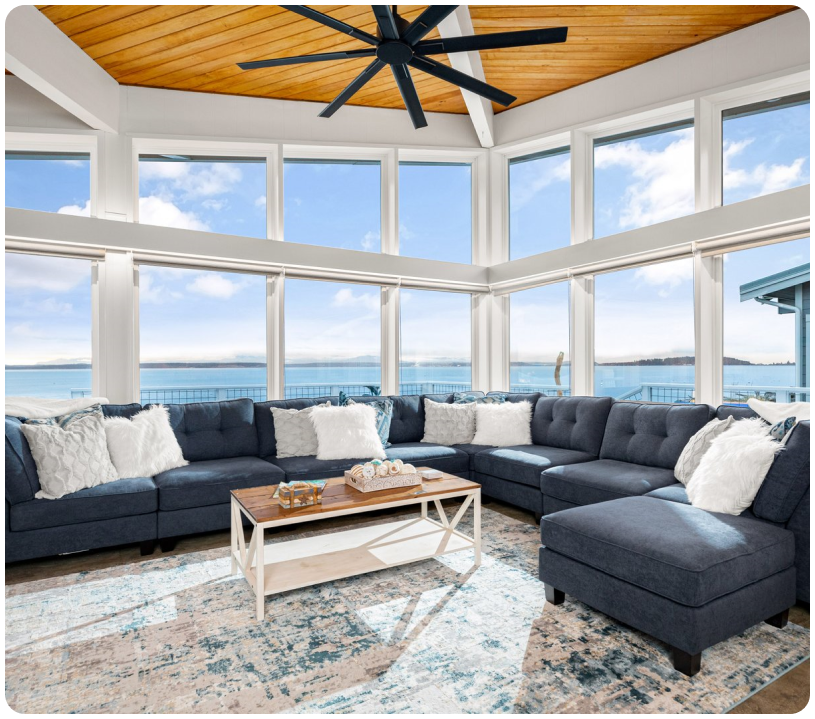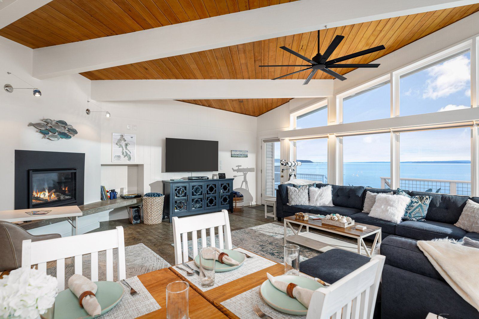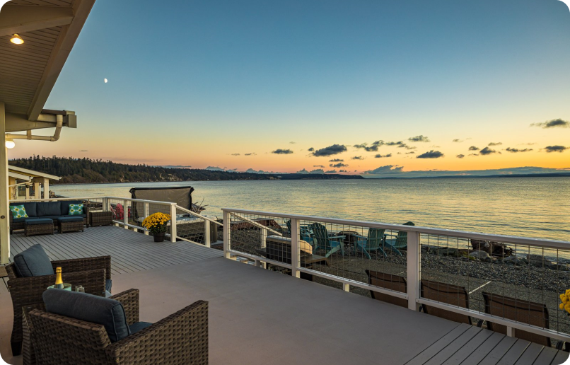 A stunning Beachfront Paradise! This architectural mid-century modern home sleeps 8+ with vaulted ceilings offering panoramic views of the Ocean, Olympics, Cityscapes, Coupeville Ferry, marine traffic and all the wildlife you can imagine! One of the best fishing sites on the island, you can literally watch the salmon jump at times! Beachcomb, watch dolphins, whales, seals, porpoises, eagles and all types of native birds. This is a beachcomber’s paradise with miles of unobstructed beach to explore! Enjoy fishing in coveted “Admiralty Bay” where the silvers and pinks run and jump for your entertainment! Fish for salmon on the beach! Throw a crab pot & enjoy your catch in the outdoor fish cooker! We are close to gorgeous state parks and charming towns nearby! Bring the whole family, your best friends or enjoy the seclusion yourself in the hot tub, on the wrap around deck or at the firepit! Pamper yourself with heated kitchen and bathroom floors, air-conditioning, a gas fireplace, and access to the Community Pool (seasonally)! It is pretty magical enjoying your morning coffee on the expansive deck or in the hot tub. Did I mention the breathtaking sunsets?